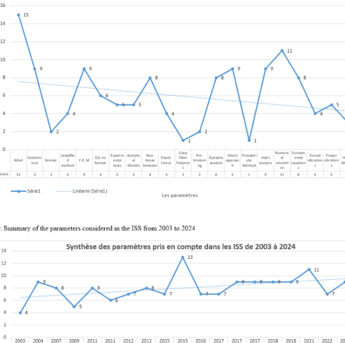 The aim of our study was to find the ideal method for studying the soil-structure interactions (SSI) of guyed towers or masts. The main difficulty was finding behavioral laws and models capable of integrating the 22 parameters that had been identified. To do this, we reviewed the literature from the last 20 years. We grouped the various models into tables and graphs. There is no single excellent method for calculating the structure of soil-structure interactions (SSI). However, we found that there are three main methods: the sub-structure method integrates 47% of 22 parameters, the direct method (Global) integrates 47% of 22 parameters and the hybrid method integrates 53% of 22 parameters. The most widely used method is hybrid because it combines the advantages of the other two, such as sophisticated 3D modeling, probabilistic approaches, and new in-situ testing technologies (triaxial and cyclic loading tests). But our results are limited because they are a function of the works that have been available to us over the last 20 years. They are not fixed; they evolve over time and space.